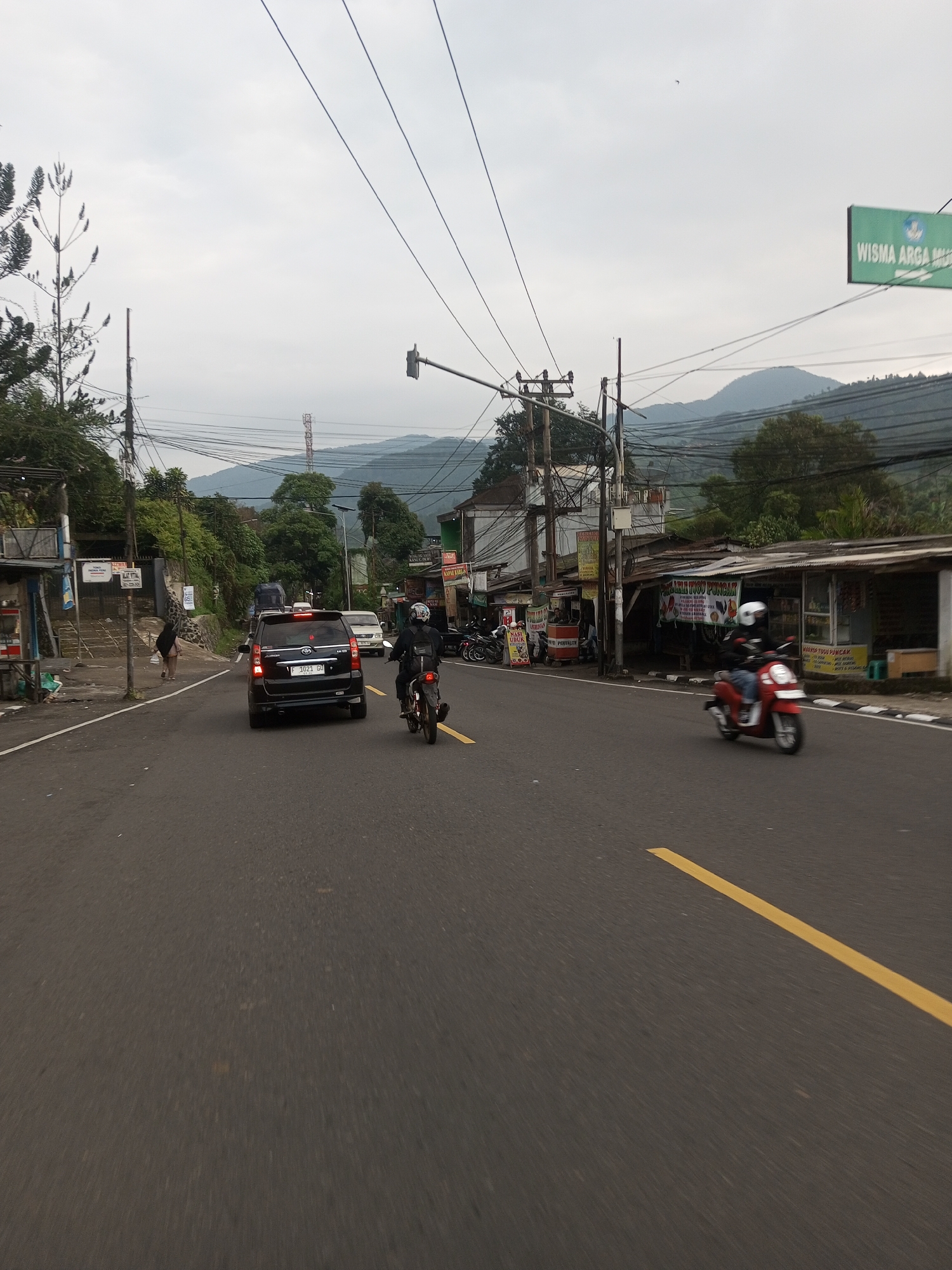 Here is a description of the image: The image shows a roadway in a rural area, likely a small town or village. A black car is traveling on the road, followed by a motorcycle. On the other side of the road, another motorcycle is in motion. Buildings and shops line the side of the road, indicating a commercial area. In the background, mountains are visible under a cloudy sky. Overhead, there are power lines crisscrossing the view. A sign reading "WISMA ARGA MU" is visible on the right side of the image.