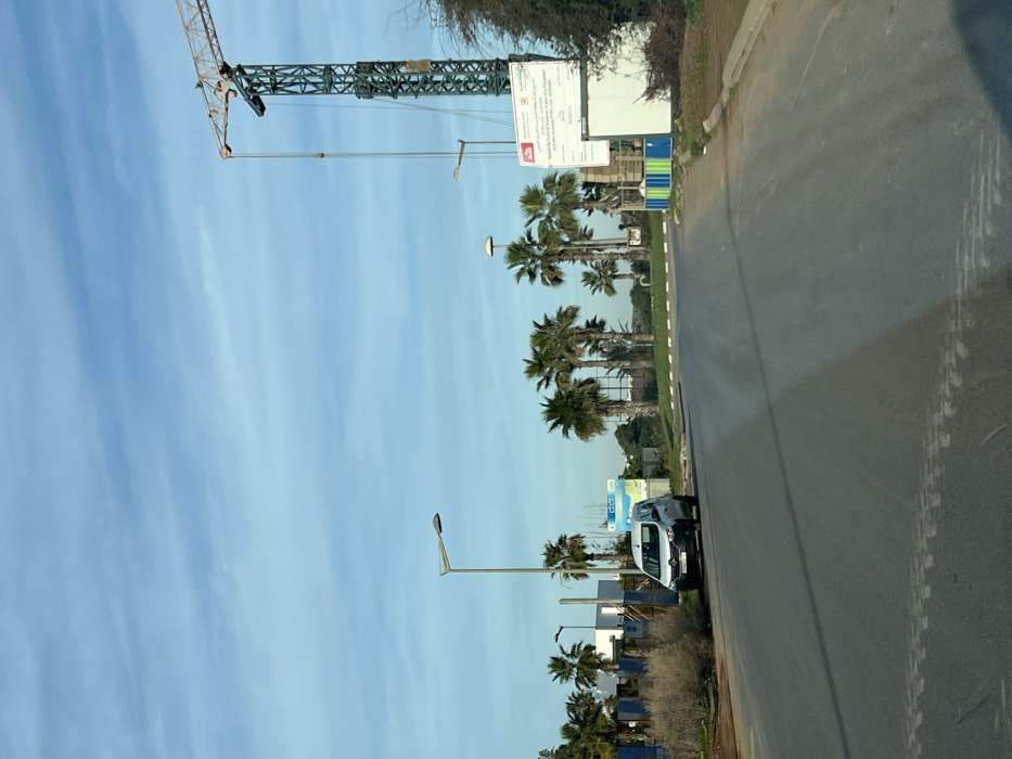 A roadside scene features palm trees lining the edge of a roadway. A light gray van is parked beside a road sign. Above the trees, a construction crane is visible against a blue sky with faint clouds. Street lamps line the road. A construction sign stands tall near the palm trees. The road has visible tire tracks.