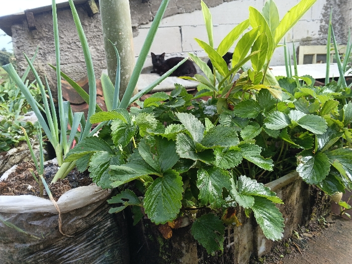 A vibrant garden scene showcases various plants, including leafy green strawberry plants and tall, slender onions growing in a white pot. Bright green leaves of another plant are interspersed amongst the foliage. In the background, a blurry grey brick wall serves as a backdrop, with a black cat lounging on top. A vertical pipe stands near the wall. The scene is bathed in natural light.