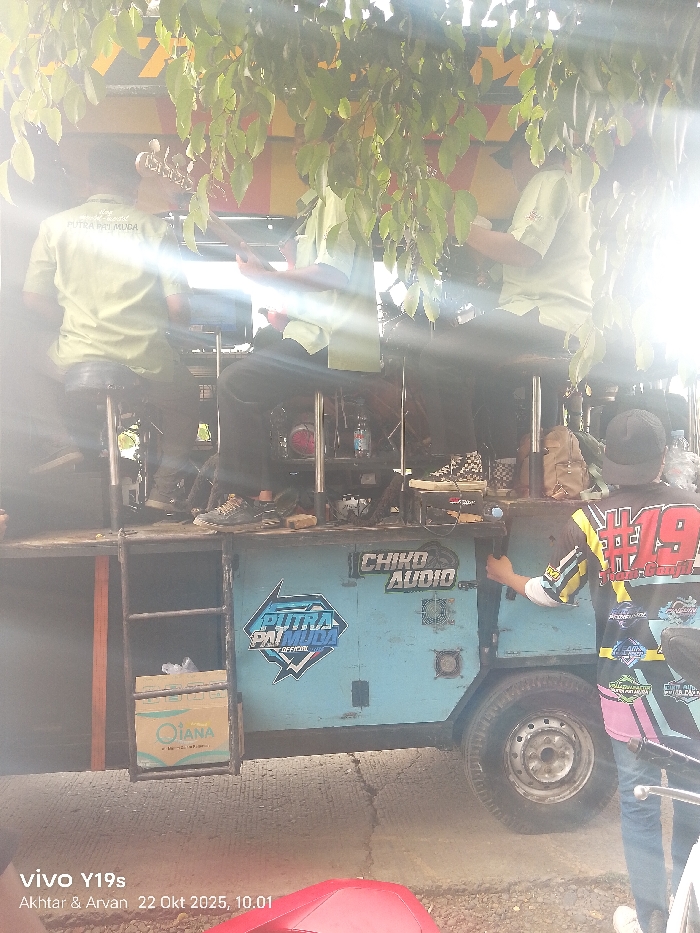 The image captures an outdoor scene in Wanguk, Indonesia, featuring a mobile musical performance or sound system setup. Three individuals, dressed in light green short-sleeved shirts, are positioned on an elevated platform. One on the left plays a bass guitar, while another on the right operates a keyboard-like instrument. The shirts bear "PUTRA PAI MUDA" text. This platform is integrated into a light blue custom vehicle or trailer, which displays "CHIKO AUDIO" and "PUTRA PAI MUDA OFFICIAL" logos on its side panel. The vehicle has one visible wheel on the right and an attached metal ladder on the left side, extending to the cracked asphalt pavement below. The platform and lower sections of the vehicle contain various sound equipment, cables, a red and black basketball, and plastic beverage bottles. A cardboard box labeled "QIANA" rests near the ladder's base. On the ground to the right, a fourth individual, wearing a black cap and a black and multi-colored jersey with the number "#19" on the back, stands holding onto the vehicle. Overhead tree foliage obstructs the top of the scene, causing significant sun glare and lens flares across the upper portion of the image.