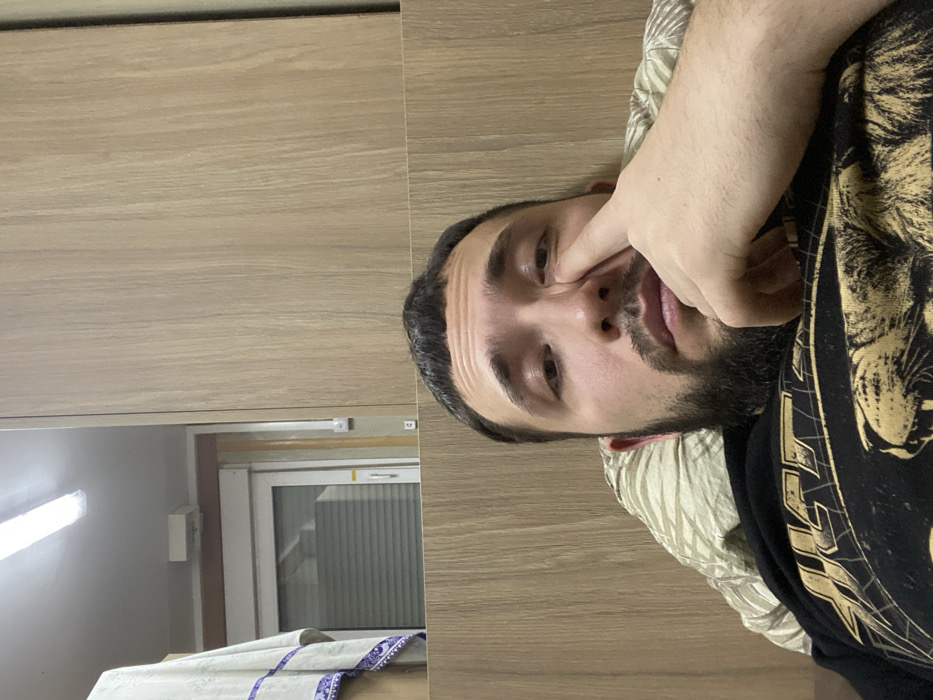 An adult male is depicted in an indoor setting. He has short dark hair, a beard, and is wearing a dark t-shirt featuring a light-colored graphic design that includes text and a stylized animal, possibly a lion. His head is resting on a patterned pillow. His right index finger is positioned near or pressing against his right lower eyelid. He is looking directly towards the viewer. The background features light brown wooden paneling directly behind him, with a white wall visible above it. In the upper left quadrant, a white-framed window with partially closed horizontal blinds is visible, partially obscured by a light-colored fabric with a blue pattern draped over an unseen object. A fluorescent light fixture is illuminated on the white ceiling. To the right of the window, a light brown wooden cabinet or wardrobe is visible, and a white electrical switch or outlet is mounted on the wall. The scene is illuminated by artificial light. The specific city of Koskolovo, Russia cannot be verified from the visual information presented.