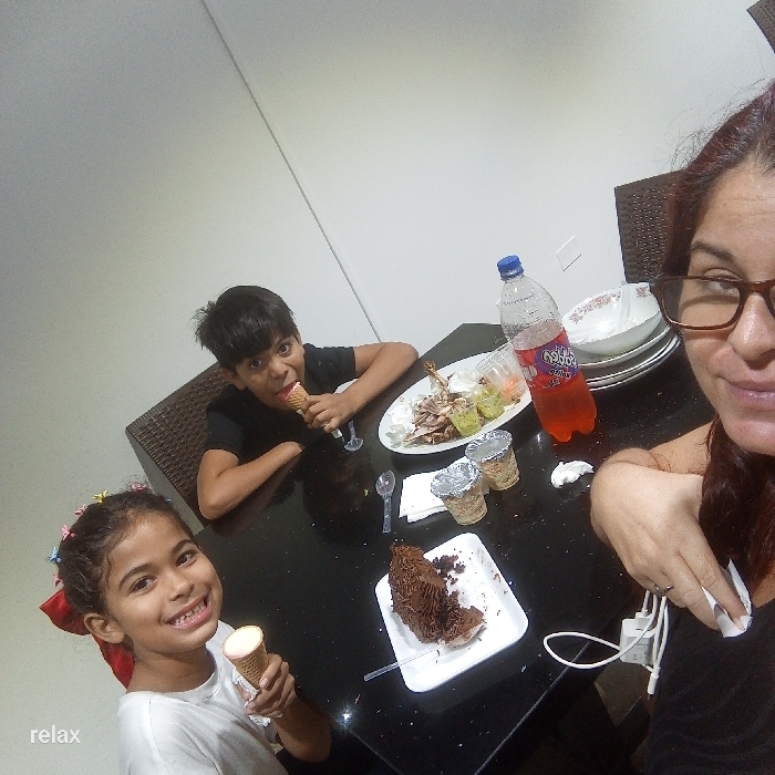 A group enjoys a meal together. A woman wearing glasses takes a selfie. A boy eats an ice cream cone with a playful expression. A girl smiles while holding a similar treat. The black table is covered with dishes, including a plate of food scraps, a chocolate cake, and a bottle of red soda. Cutlery and small containers are also visible. The background is a simple white wall.