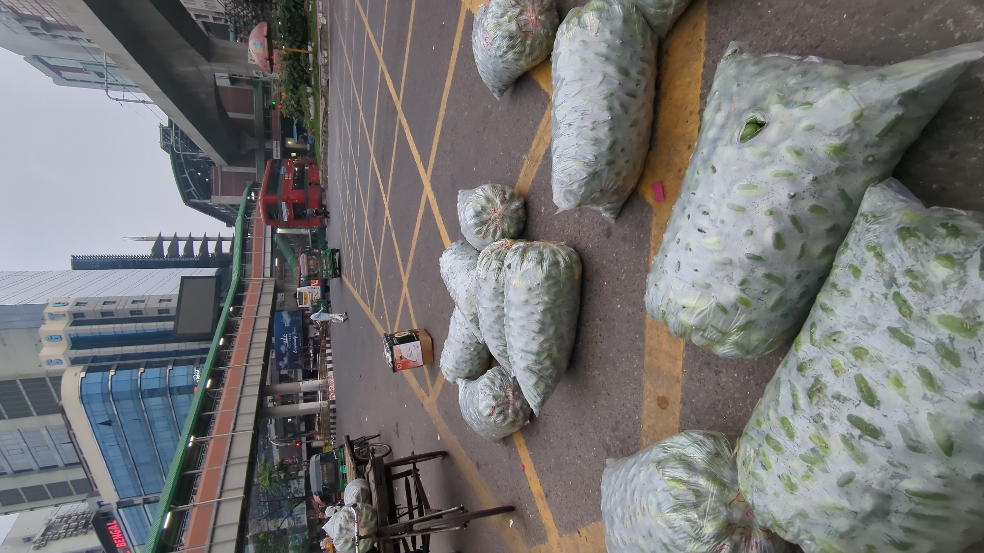 street scene in Dhaka, Bangladesh, identifiable by the architectural style, transport vehicles, and the presence of Bengali signage. The scene is dominated by a collection of large plastic bags filled with what appears to be snake gourds, spread out on a city street marked with yellow diagonal lines. The bags appear to be filled with a large quantity of the produce, suggesting a wholesale or market-related activity. In the background, urban infrastructure is visible, including a double-decker bus, auto rickshaws, buildings, and an elevated structure resembling a pedestrian overpass or metro line. A handcart, presumably used for transporting goods, is also present. There is a cardboard box near the bags. The overall impression is that of a bustling commercial area in the city.