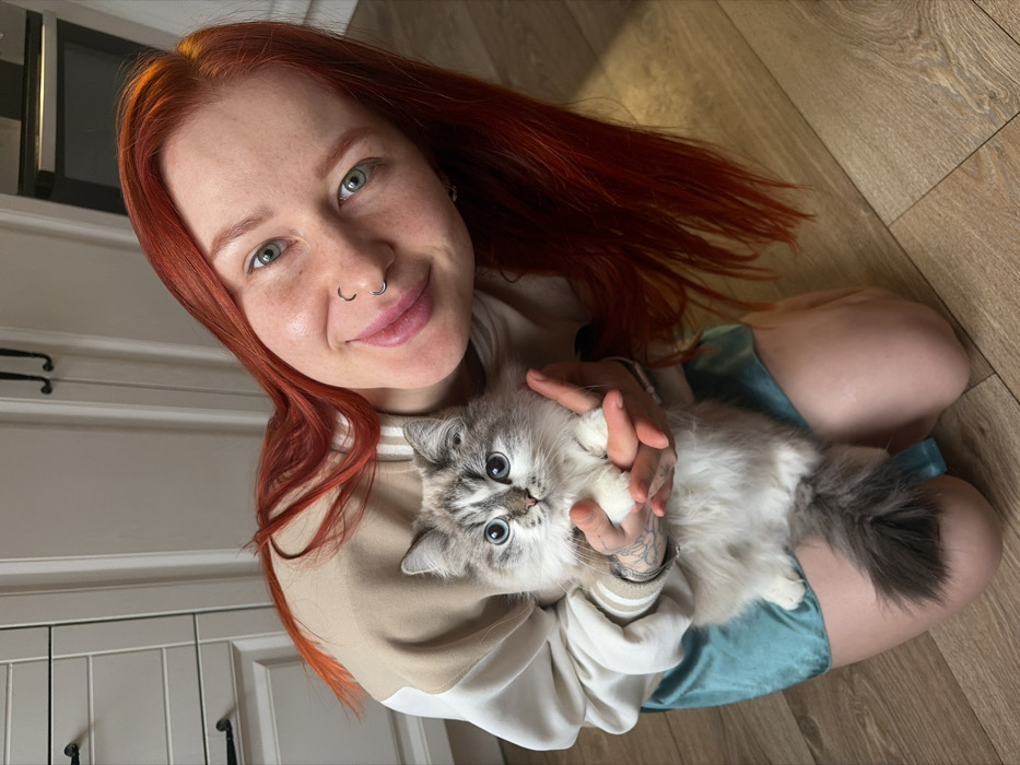 The scene depicts an indoor environment, specified as a location in Rostov-on-Don, Russia. A female individual with long, bright red hair, light-colored eyes, and facial piercings (two rings on the left nostril, one on the right, and one on the philtrum) is shown kneeling on a light-colored wood-patterned floor. She is wearing a two-toned beige and off-white long-sleeved top and turquoise-colored shorts. A tattoo is visible on her left forearm. The individual is holding a long-haired cat with white/cream fur, grey tabby markings on its face, ears, and tail, and blue eyes. Both the individual, who displays a slight smile, and the cat are looking directly at the camera. In the background, light-colored kitchen cabinets with dark handles are visible, alongside a partial view of a dark appliance, possibly an oven or microwave, in the upper right portion of the image.