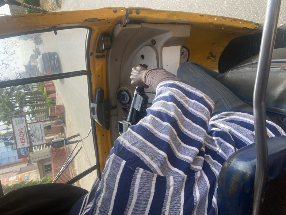 Inside a yellow vehicle, likely a tuk-tuk, the driver is visible. They are holding the steering column with their right hand. The driver wears a striped blue and white garment and denim jeans. Outside the window, a street scene features buildings, signs with "EBOMI" visible, and a passing car. The scene is viewed from inside the vehicle's interior, showcasing the dashboard and the driver's seated position.