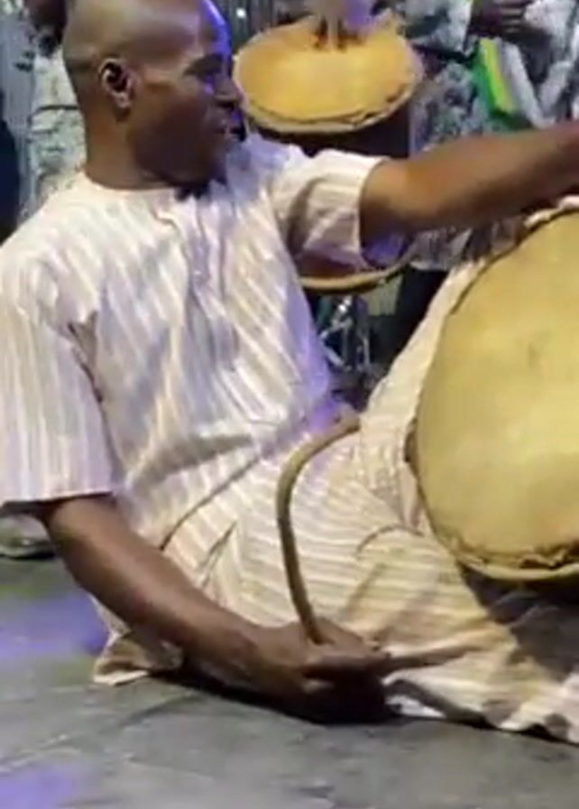 A man is seen seated on the floor, playing a drum that rests on his lap. He wears a striped shirt and pants. Surrounding him are several other individuals, some holding and playing additional drums, while others have on colorful traditional attire. The setting appears to be a stage, as indicated by the presence of stage lighting in the background.