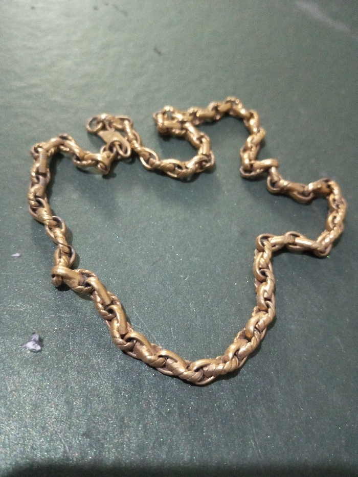 A gold chain lies on a dark green surface. The chain is thick, constructed of interlocking links that resemble twisted ropes. The texture suggests wear or tarnish, giving it an antique appearance. The chain's arrangement forms a loose, asymmetrical curve. A small, partially visible object sits near the bottom left of the image.