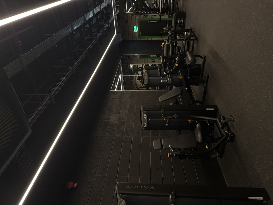 The image displays an unoccupied gym interior located in Dudley, United Kingdom. The environment exhibits a dark, industrial aesthetic, characterized by black block walls and a dark ceiling featuring exposed overhead utilities such as conduit, ductwork, and cable trays. The space is illuminated by multiple linear LED strip lights embedded in the ceiling. The floor is covered with dark, textured rubber matting. On the far left wall, a red fire alarm call point is visible. The foreground and mid-ground are populated with various black-finished strength training machines, including a partial view of a "MATRIX" branded machine on the left, a seated chest press machine, and a leg curl/extension machine, all incorporating subtle orange accents on their adjustment mechanisms. The right wall is partially covered by large, rectangular mirrors, reflecting sections of the gym and additional equipment, including weight racks and benches, further into the background. Towards the rear right, a dark door is visible, framed by a prominent bright green border and surmounted by an illuminated green "exit" sign with a left-pointing arrow. No individuals are present, and no actions or interactions are depicted.