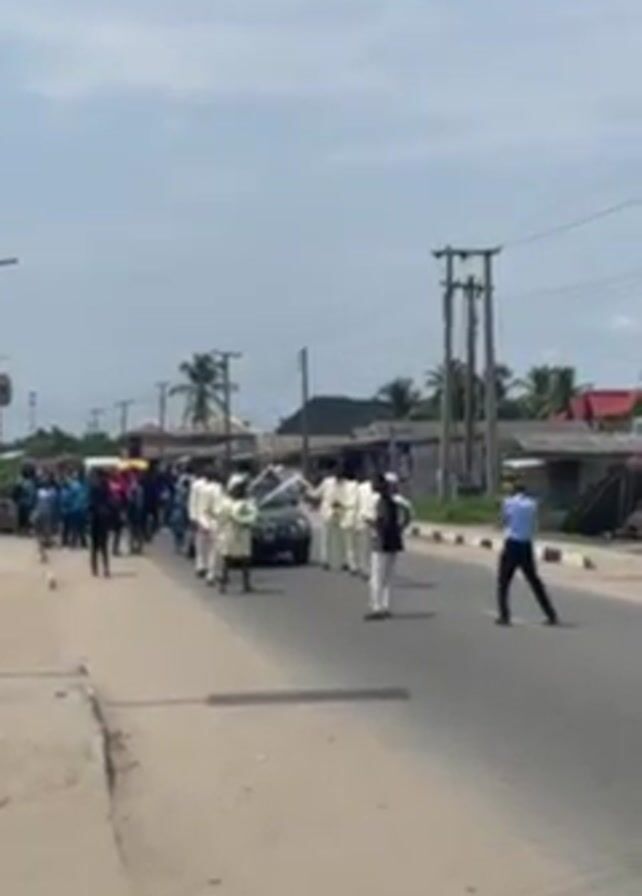 procession moving down a street. A group of people dressed in white are walking behind a black SUV decorated with what appears to be white flowers. Other people are walking alongside and behind the group in white, some dressed in dark clothing. The road is paved and has a painted white line marking the edge. There are buildings and trees visible on either side of the street. Power lines run overhead. A man in a blue shirt and dark pants is standing in the road, possibly directing traffic. The sky is overcast.