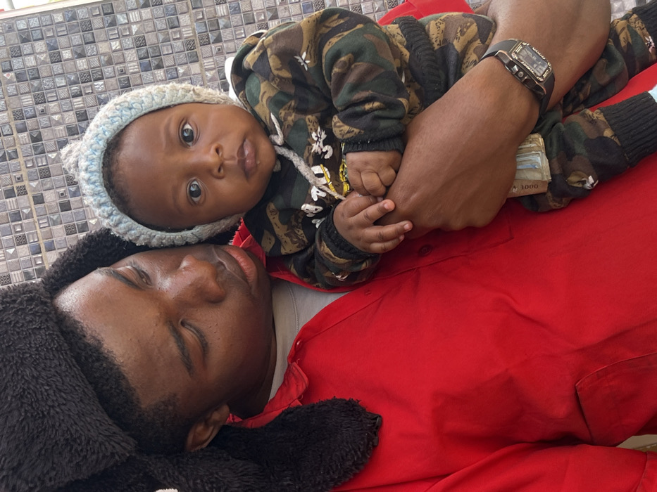 An adult male holds an infant against a tiled wall background in Jos, Nigeria