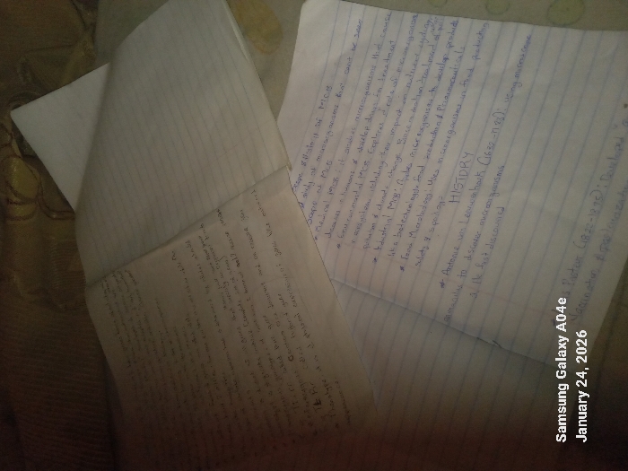 The scene depicts an indoor setting in Origi, Nigeria, featuring multiple sheets of paper with handwritten notes resting on a dark, patterned textile surface. No individuals are visible. In the foreground and central area, an open, lined notebook displays text written in blue ink. Visible headings include "HISTORY" and "Scope of M/C/B," with bulleted points detailing aspects like "Medical M/C/B," "Environmental M/C/B," "Industrial M/C/B," and "Food Microbiology." Specific references include "Antonie van Leeuwenhoek." Below this notebook, a partially obscured sheet of lined paper also contains handwritten notes. Above and to the right of the main notebook, a plain white sheet of paper is partially visible. The background consists of a dark fabric material with a subtle, abstract, or floral pattern. The image exhibits a digital watermark in the lower-left corner, stating "Samsung Galaxy A04e January 24, 2026." The lighting suggests an ambient, possibly artificial, source.