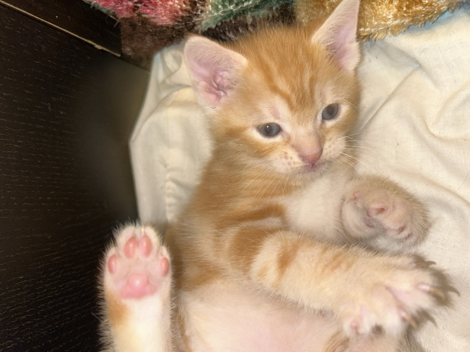 An adorable, small, orange tabby kitten lies on its back, paws up