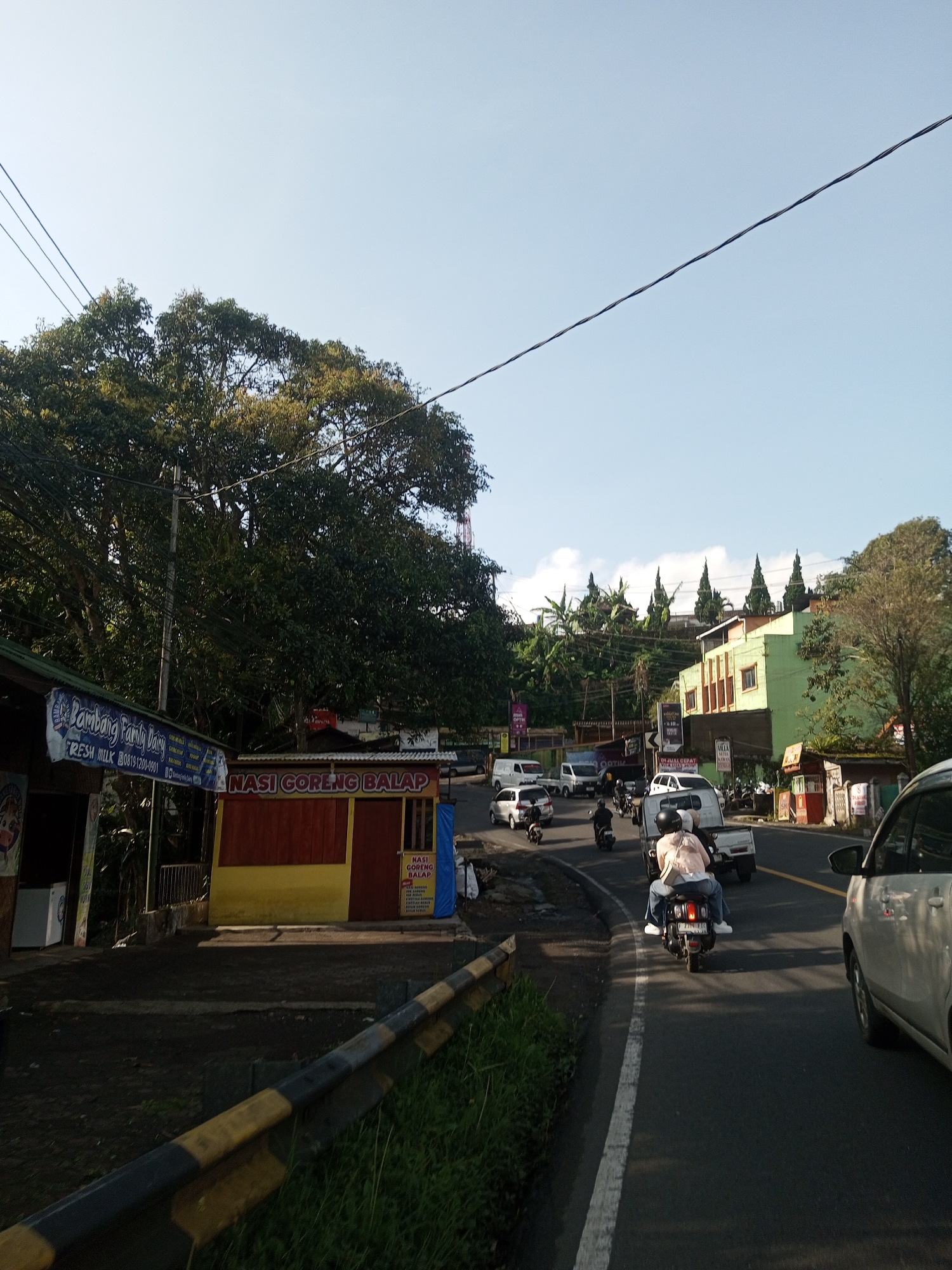 street scene with various vehicles, including a motorcycle with two people on it, cars, and a truck. There are roadside establishments, one of which is labeled "Nasi Goreng Balap" and another that says "Bambang Family Dairy." Vegetation, including a large tree, is present. The buildings are mostly two-story and painted in different colors, like green and red. The sky is clear with overhead power lines. The street has a painted white line denoting lanes. It is not in Nhot Chang, Laos.