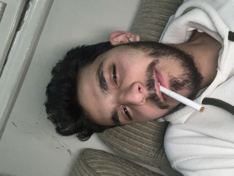 A man with dark hair and a beard lies on a cushion wearing a white hoodie. He holds a cigarette in his mouth. His eyes are half-closed. A portion of a white wall is visible in the background.