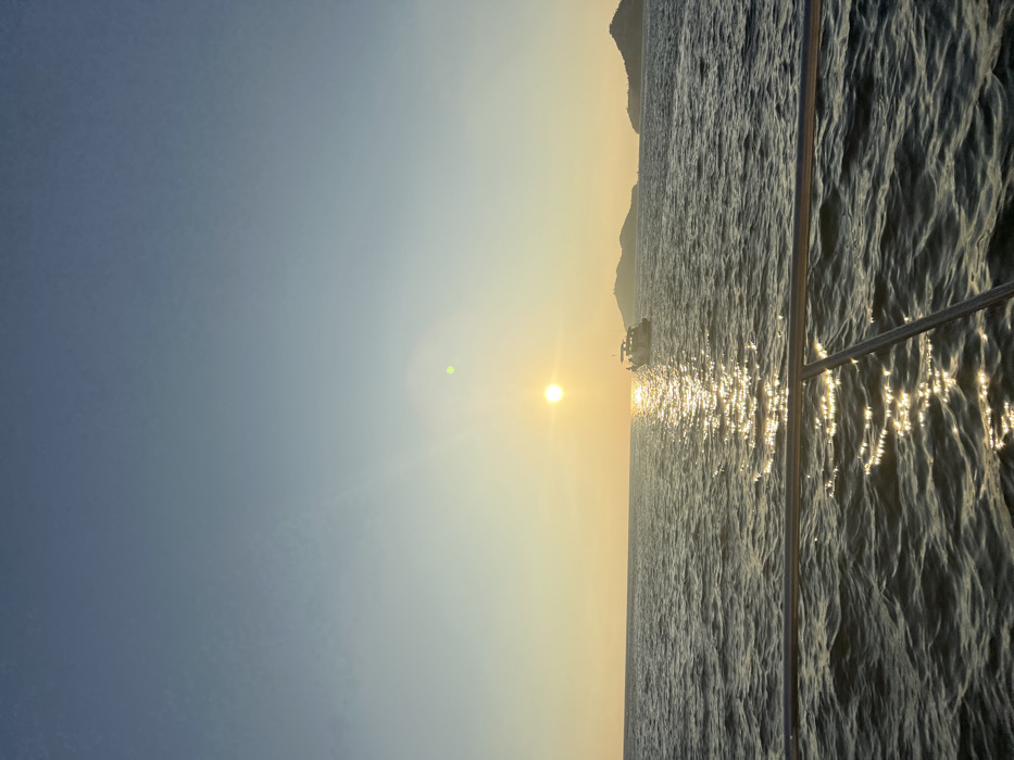 The image captures a serene seascape at sunset, with the sun's golden orb dominating the horizon. Shimmering reflections dance across the water's surface, leading towards the distant shoreline marked by silhouetted hills. Part of a vessel, featuring metallic railings, is visible in the foreground on the right, suggesting a vantage point from a boat. The sky blends from deep blue to light yellow. The overall impression is one of tranquility and natural beauty.