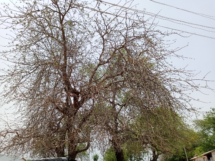 large, bare-branched tree with some green leaves