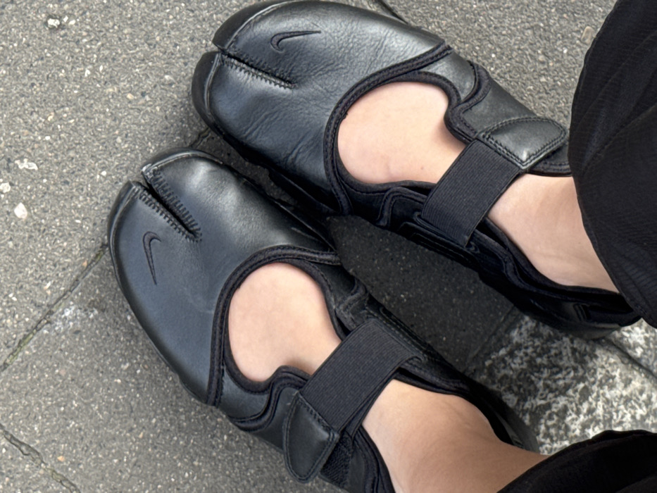 The image presents a close-up, top-down view of two feet positioned on an outdoor ground surface. A person wears a pair of black Nike Air Rift Tabi shoes. These shoes feature a split-toe design, a black, smooth upper material, exposed instep and arch areas, and black elasticated straps that secure the footwear across the foot. A small, black Nike swoosh logo is discernible on the toe section of each shoe. Bare skin is visible on the insteps and ankles. Dark, likely black, fabric from trousers is visible at the lower edges of the frame, partially covering the wearer's lower legs. The feet rest on a textured grey surface, consistent with concrete or asphalt pavement found in an urban environment. No specific visual identifiers or landmarks are present within the image to determine the precise location as Dusseldorf, Germany.
