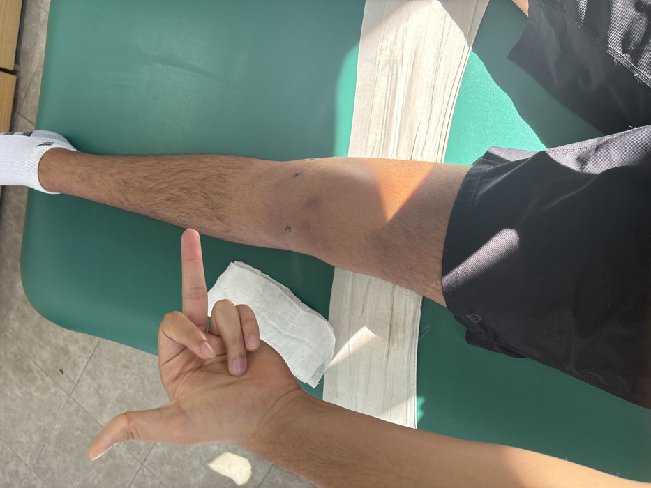 - "The image displays an overhead perspective of a person's lower right leg and a left arm, situated on a bright green examination table in the city of Las Crucitas, Mexico" by FM-ZjnhV2, licensed under CC BY 4.0