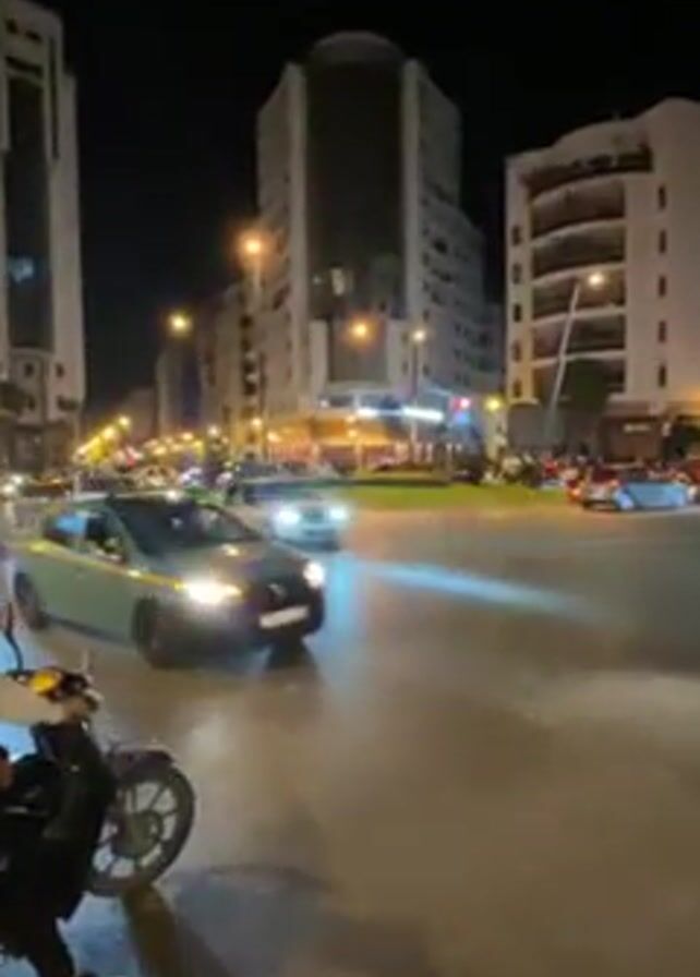 busy city intersection at night. Cars and motorcycles are moving through the intersection, and the city's buildings are lit up in the background. There's a person on a motorcycle at the side of the road in the foreground. Cars can be seen making U-turns and passing through the intersection.