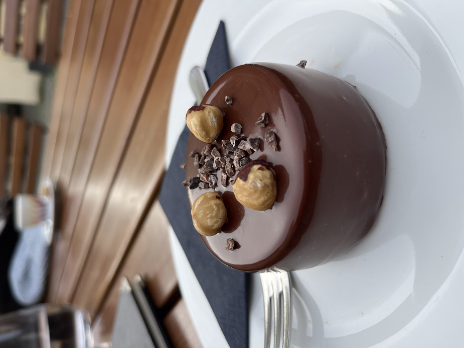 The image displays a close-up of a dessert on an outdoor cafe table in Meisenheim, Germany. A cylindrical chocolate dessert, featuring a glossy dark brown glaze, is centrally positioned on a white circular plate. The top surface of the dessert is garnished with three whole, shelled hazelnuts and numerous irregular dark fragments consistent with cocoa nibs. A silver-colored dessert fork rests on a folded dark blue napkin to the left of the plate, with a partial view of a small silver spoon to the right, also on the napkin. The plate and napkin are situated on a light brown wooden slatted table. The background, which is out of focus, shows a clear glass of water and a dark-covered notebook on the left, and a small white espresso cup on a saucer on the right. No individuals are visible in the frame.