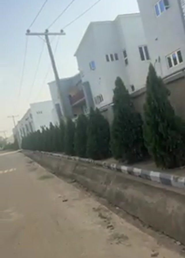 street view with modern two-story buildings on one side of the road. A row of evergreen trees lines the perimeter of the buildings, separated from the road by a concrete divider. An unevenly-paved road stretches to the vanishing point. An leaning wooden utility pole is visible on the roadside, with power lines stretching across the sky. The sky is light blue with a few scattered clouds.