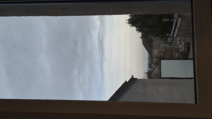 A view from a window shows an overcast sky meeting a horizon line of land or water