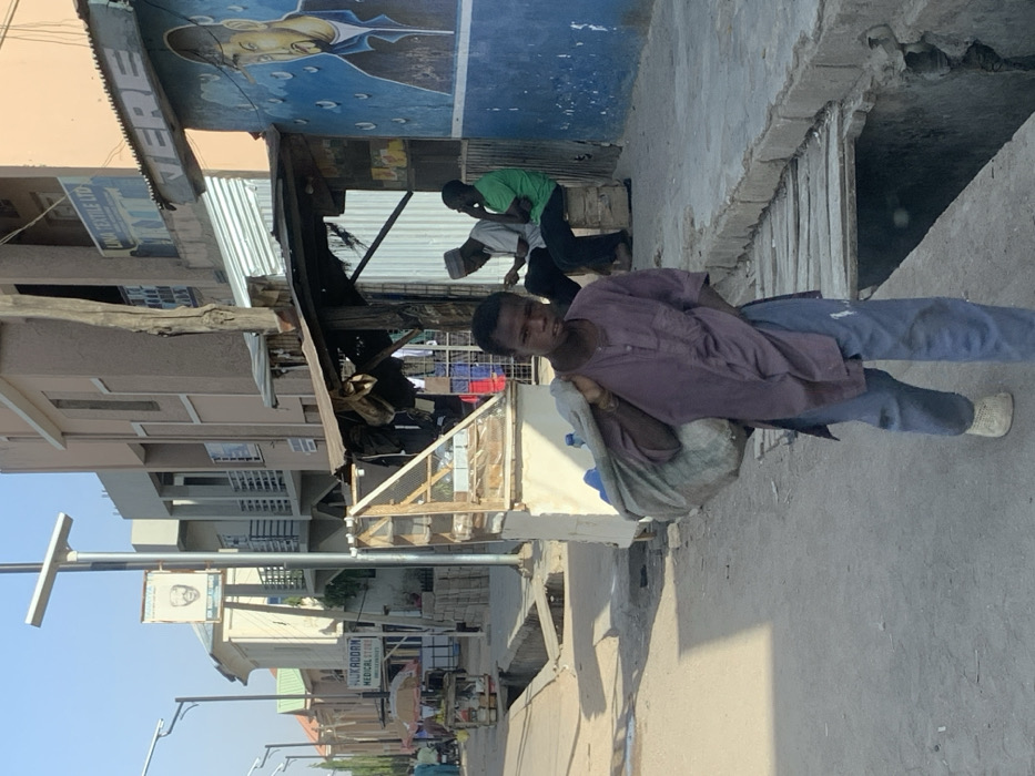 The image depicts a street scene in Hotoro South, Nigeria, under clear daylight conditions. In the foreground, a young male, likely a child or adolescent, walks towards the camera on the right side of a paved street. He wears a plum-colored tunic-style top, blue trousers with a white logo on the left leg, and light-colored slip-on shoes. He carries a large, light-grey sack over his left shoulder. His gaze is directed towards the camera. To the right of the young male, an open concrete drainage ditch runs parallel to the street, spanned by a wooden plank. Adjacent to this, under a makeshift shelter with a corrugated metal roof, two adult males are seated. The male on the left, wearing a light-colored tunic and cap, is looking down at a mobile device. The male on the right, in a green t-shirt, looks towards his right. The shelter covers a stall with a blue wall, painted with a large portrait of a man and partial text "VERE". To the left of this stall, a white, rectangular display unit with a mesh-covered triangular top and a blue water bottle is visible. In the midground and background, the street is lined with a mix of multi-story buildings. On the left, solar-powered streetlights are visible. A sign for "KUKADDAN MEDICAL STORE" is seen on a building further down the street, and another sign with a stylized face and text "S&N BABANGIDA KASIM AHMED" is mounted on a streetlight pole. On the right, a sign for "LINA TEXTILE LTD" is visible on a building. Further down the street on the left, faint figures of people and a pushcart with an umbrella are present. The ground features sections of pavement and exposed dirt, with some building materials stacked near the roadside. Strong shadows indicate a bright, clear sky.