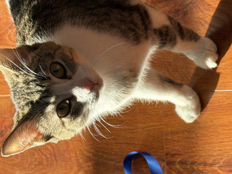 A cat lies on a wood floor, illuminated by sunlight. The cat's fur is a mix of brown, gray, and white. It has large, expressive green eyes and a pink nose. The cat is looking directly at the camera. A small blue ribbon sits near the bottom of the frame. The cat's relaxed posture and the warm lighting create a peaceful scene.