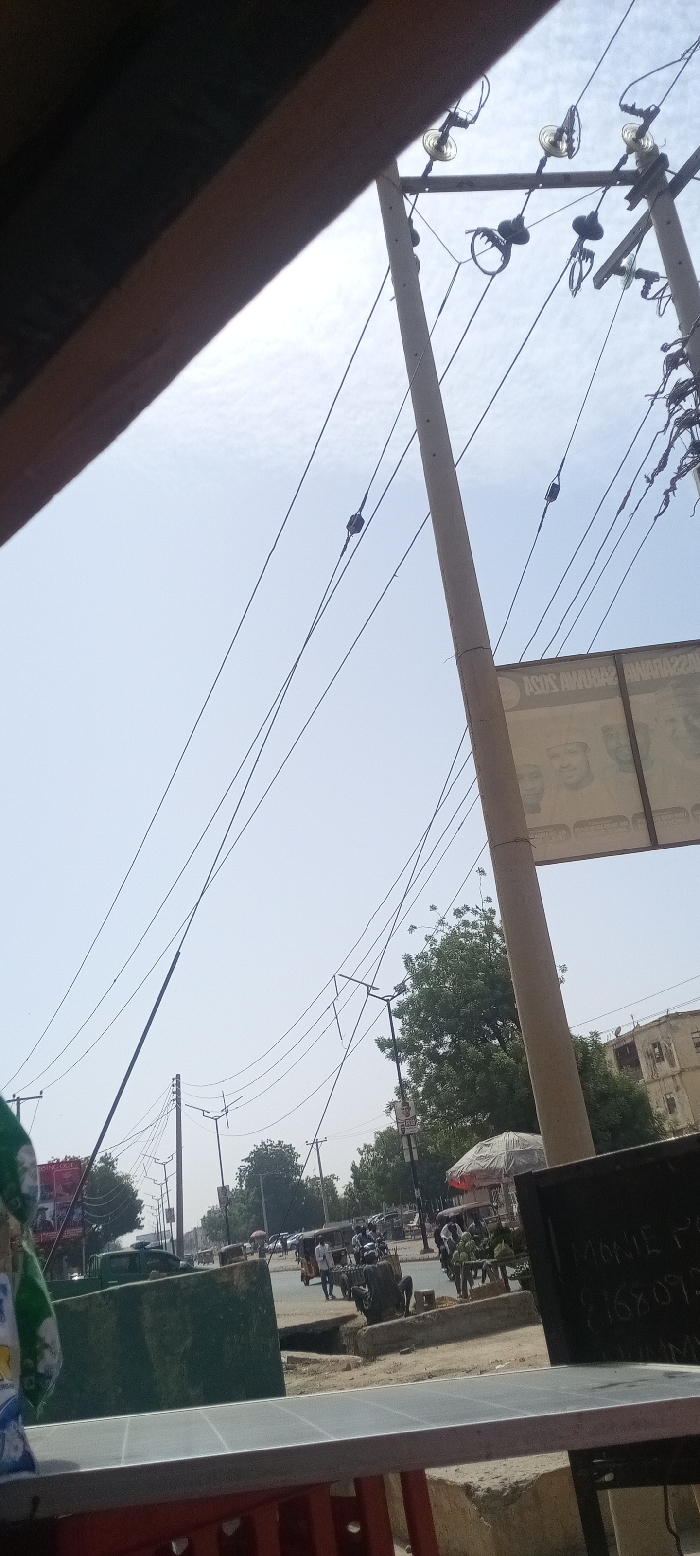 The image depicts an outdoor urban scene in Unknown, Unknown, viewed from a slightly elevated, covered position, likely from a building or stall. The foreground features a brown structural element extending diagonally from the top left. Below, a metallic, rectangular surface, possibly a solar panel, rests on a reddish frame. To the immediate right, a dark chalkboard with white, handwritten text, partially legible as "MONIE P" and numbers starting "8168073," is visible. A green object, possibly a plastic bag, hangs partially visible on the far left. A dominant, light-colored concrete utility pole stands prominently on the right side of the midground, extending upwards and out of frame. It supports multiple power lines strung with insulators. Another, thinner utility pole is visible further to the left. A large, rectangular billboard, with partially visible faces and text, including "AZIS AWWAX..." and "AWWAN 2023," is attached to the main utility pole. Below the power lines, a busy street scene unfolds under a bright, hazy sky with scattered clouds. Numerous vehicles are present, including cars (one dark green pickup truck visible on the left), motorcycles, and yellow auto-rickshaws. Multiple pedestrians are seen walking and standing along the street and sidewalks. Several market stalls or temporary structures are set up, displaying what appear to be fresh produce, such as green vegetables or fruits, on wooden stands. One individual is seated on a low concrete barrier next to an uncovered ditch or drainage channel on the street level. Green-leafed trees are scattered throughout the midground, providing shade in areas. In the background, multi-story buildings of varying architecture are visible, some appearing residential or commercial, under the distant sky. The ground in the immediate street area appears to be a mix of dirt, concrete, and unpaved sections, with visible construction debris or uneven surfaces.