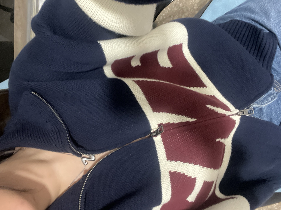 A close-up, chest-level shot depicts an individual indoors in Valencia, Spain. The subject is wearing a navy blue knitted cardigan with a half-zip collar and a full-length metal zipper down the front. The cardigan features large block letters spelling "TIME" in burgundy with white outlines, prominently displayed on the torso. The zipper is partially open at the top, revealing a silver-colored necklace with a distinct "V"-shaped pendant resting against the subject's visible skin. Below the cardigan, light blue denim jeans are visible. The background is out of focus, showing indistinct light-colored surfaces and a hint of a light blue object to the right.