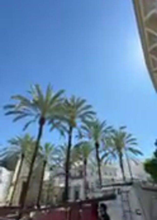 The camera faces upwards toward a clear blue sky, framed by the edge of a building on the right side of the frame. Tall, thin palm trees sway gently in the breeze, with their green fronds reaching towards the sky. Beneath the palm trees, a construction site is visible, with red and yellow barriers cordoning off the area. A white truck is parked behind the barriers, with a person standing near it. A few people stroll along the street in the distance, adding a sense of life and movement to the scene.