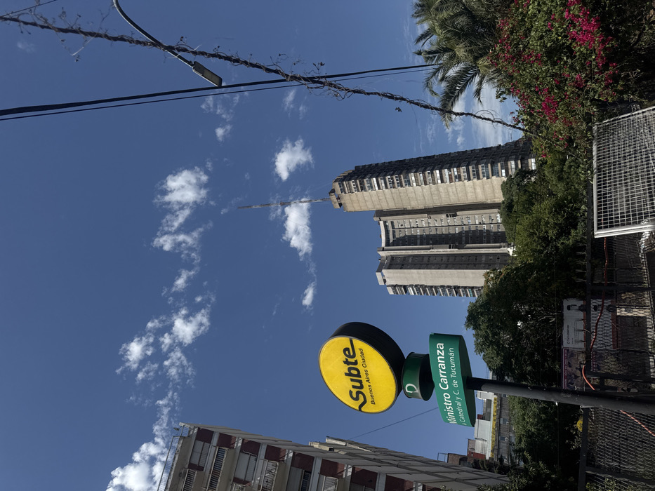 A low-angle shot in Buenos Aires features a bright blue sky with scattered clouds. Below, buildings rise, including a tall, concrete structure with a spire. A yellow "Subte" sign marks a metro entrance, with a green sign indicating "Ministro Carranza." Overhead, power lines crisscross the sky. Foliage and flowers add a touch of nature.