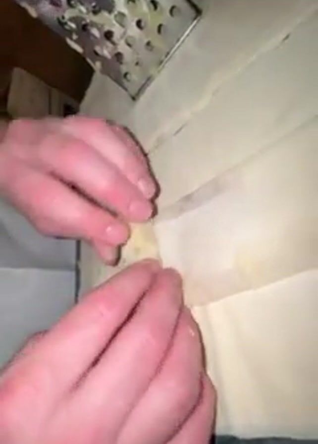 A man is grating butter onto a sheet of phyllo dough