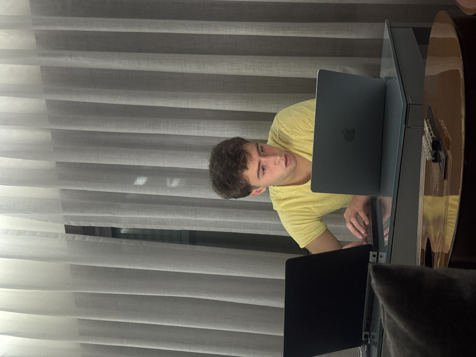 A young man with short curly hair and a yellow t-shirt is seated at a glass table, operating a dark-colored laptop. Another laptop sits in the foreground, partially obstructed by a gray blanket or pillow. A guitar rests on the table to the right of the man. Vertical sheer curtains cover the background, allowing some light to filter through. A dark horizontal line, likely a window frame, is visible behind the curtains.