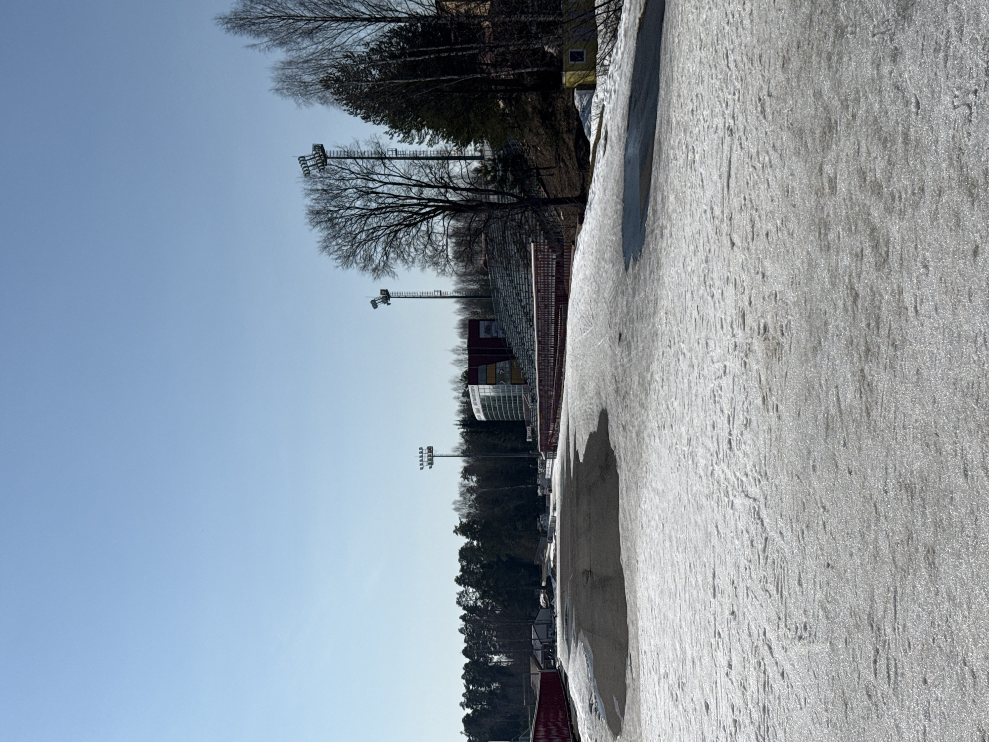 This image displays an outdoor sports complex in Sedlovo (Shashkovskaya S/A), Russia, under a clear, light blue sky. The foreground consists of a wide, level area covered in melting snow and ice, with a distinct, irregularly shaped patch of dark, exposed asphalt or pavement in its center. To the left, a long red-railed barrier or structure extends into the distance. In the midground, gray stadium bleachers are visible, partially obscured by a large, bare deciduous tree. Multiple tall metal light towers, each topped with floodlights, stand erect throughout the complex. Further right, a modern building with a curved glass facade and a red roof section is present. A dense line of trees, comprising both deciduous and coniferous species, forms the background horizon. Patches of snow persist on the ground beneath the trees and in various areas of the complex. No individuals are depicted in the scene.