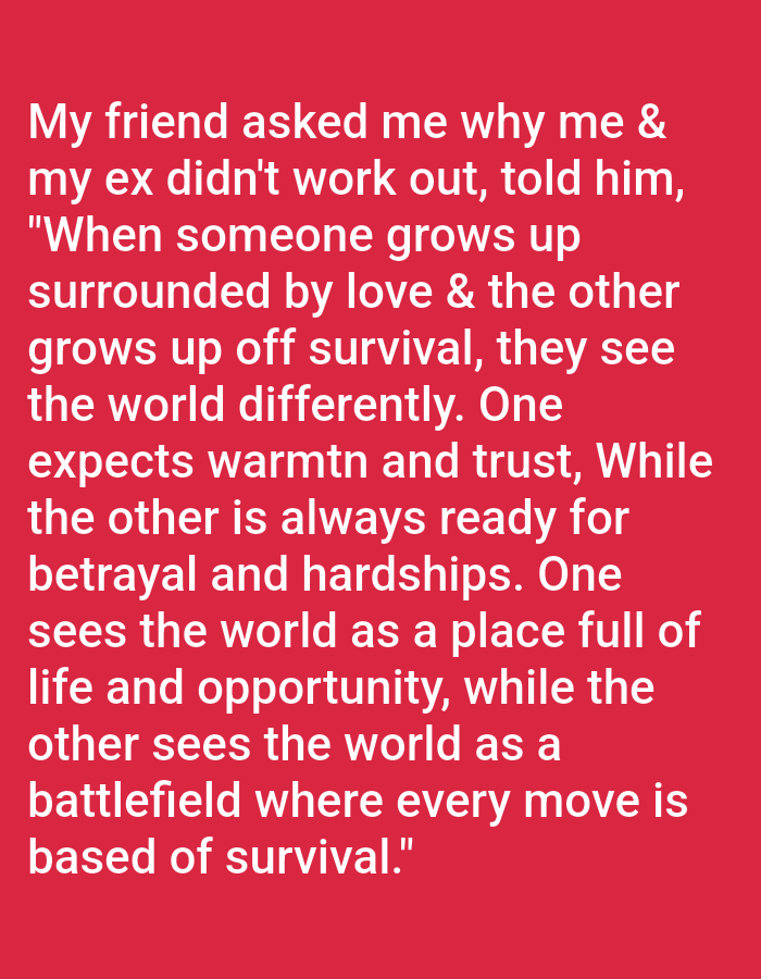 The image displays white text against a solid red background. The text, presented as a quote or statement, describes a philosophical difference in worldviews between individuals raised with love versus those raised for survival, impacting expectations of trust or readiness for betrayal. Specifically, the text reads: "My friend asked me why me & my ex didn't work out, told him, "When someone grows up surrounded by love & the other grows up off survival, they see the world differently. One expects warmtn and trust, While the other is always ready for betrayal and hardships. One sees the world as a place full of life and opportunity, while the other sees the world as a battlefield where every move is based of survival."" There are no visible people, subjects, objects, actions, interactions, or environmental features depicted beyond the text and its background. The image provides no discernable geographical context, and therefore, no specific location within Tacoma, United States, can be identified or inferred.