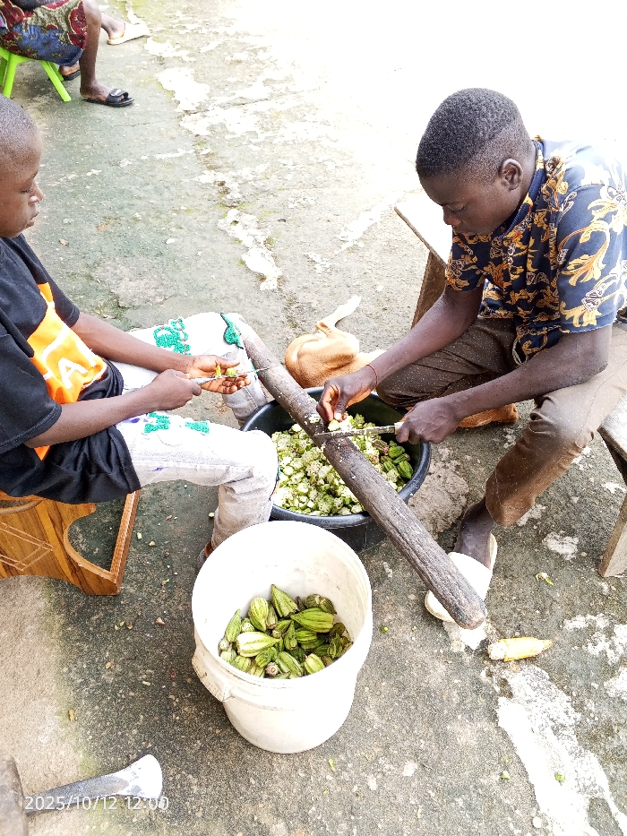 This image depicts an outdoor scene in Kamantan, Nigeria, where two males are engaged in the preparation of okra