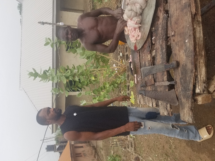 The image depicts two men standing near a wooden table, with one man in the foreground and one man in the background. The foreground man is wearing blue jeans and a black sleeveless t-shirt. He is standing with his right leg slightly bent. The background man is bare-chested and is holding a knife with his right hand. The background man is preparing a cut of meat on a large metal pan situated on top of the wooden table. The meat is unidentifiable, but it appears to be raw and possibly offal. Three long, black knives are also present on the table next to the metal pan. There are other unidentified objects on the table. The image appears to have been taken outside in a residential area. The location is Pati Ridge, Nigeria. The coordinates of the location are 7.81 latitude and 6.704 longitude. There are buildings in the background. The area appears to be relatively clean. The sky is overcast and gray. The overall scene appears to be one of casual butchering and preparation. The men appear to be working together, though there is no evidence of conversation or interaction. The tone of the image is matter-of-fact.