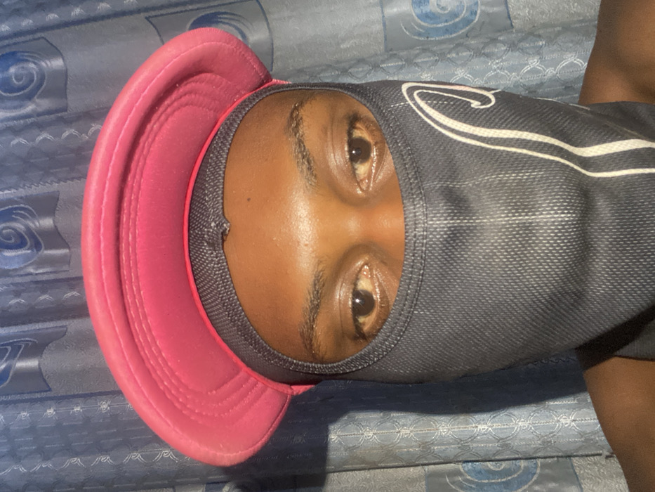 - "An individual with dark skin is depicted from the upper chest up, wearing a dark grey face mask and a bright pink flat-brimmed cap" by FM-HLBxn2, licensed under CC BY 4.0