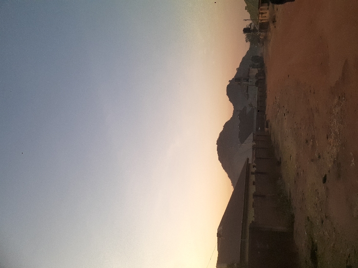 A landscape shows rolling hills and a clear sky transitioning from blue to orange. The foreground features a dirt road or path with signs of habitation, possibly buildings or simple structures. The scene is cast in the warm light of either sunrise or sunset, creating a tranquil, rural atmosphere. The mountain range in the background adds depth to the composition.