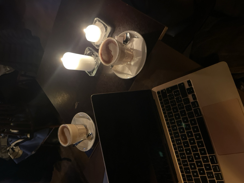 This image depicts a dark wooden table surface in a dimly lit indoor establishment located in Copenhagen, Denmark. In the lower left quadrant, a silver Apple MacBook Air laptop is open with its screen appearing dark or inactive. The laptop's keyboard, featuring a Nordic layout with keys such as 'ø' visible, is illuminated. To the right of the laptop, two clear glass mugs, each containing a light brown, frothy beverage (consistent with a latte or similar hot drink), are present on white saucers. The mug positioned in the lower right includes a small white folded napkin and a silver spoon, with the beverage exhibiting a distinct pattern on its foam. The second mug, situated in the upper left, also includes a silver spoon on its saucer. Two white pillar candles, one taller than the other, are actively burning on square, clear glass holders in the upper right quadrant, providing the primary light source for the scene. The background is dark and out of focus, with a faint blue and white patterned object partially discernible in the upper left, suggesting the presence of other items or a blurred background environment. No individuals are directly visible within the frame.