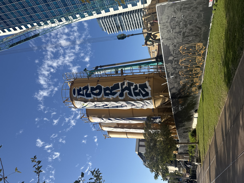 This image depicts a daylight urban scene at a construction site in Tel-Aviv, Israel, specifically near the intersection of Allenby Street and Yehuda Halevi Street, adjacent to the Tel Aviv Light Rail Red Line route. The upper portion of the frame is dominated by a clear blue sky with scattered cirrus and cumulus clouds. To the right, a significant portion of a tall, modern skyscraper with a blue glass curtain wall facade is visible, reflecting the sky and some clouds. Below and to its left, a white multi-story building is partially obscured. A large, green construction crane boom extends vertically into the sky between the main subject and the skyscraper. The central focus of the image comprises three large, cylindrical, tan-colored industrial silos, likely part of a concrete batching plant. Each silo features an external metal ladder structure and a top railing. The second and third silos from the left have white banners draped vertically down their sides. The rightmost silo's banner is prominently defaced with large, stylized black and white graffiti. In the midground, a dark construction barrier or fence with visible graffiti, including yellow outlines and white scrawls, runs horizontally across the lower frame. The word "NUR" is partially legible on this barrier. Immediately in front of the barrier is a strip of neatly maintained green grass. In the foreground, to the left, a dark gray paved surface is visible, featuring a set of parallel tram tracks. A small tree with sparse green foliage stands on the grass strip, casting shadows. In the far left background, behind the tree and tracks, indistinct urban buildings and a traffic light are visible, with faint human figures possibly present on the sidewalk. No specific human actions or interactions are clearly discernible in detail.