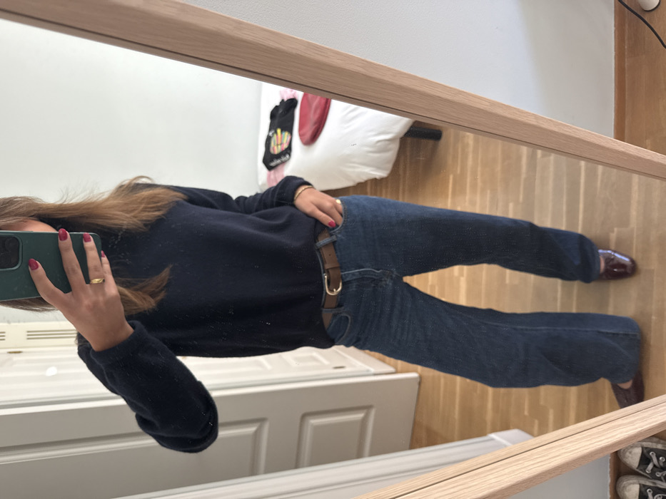 A full-length mirror selfie captures an individual standing in an interior room in Unknown, Unknown. The subject, a female with long brown hair, is obscured from the nose up by a dark green smartphone held in her left hand. She wears a navy blue long-sleeved sweater, dark blue denim jeans, and a brown leather belt with a gold-colored buckle. Her footwear consists of dark red patent leather slip-on shoes with bow details. Her left ring finger displays a gold ring, and her right hand, with pink nail polish, is partially visible near her right hip. The mirror, framed in light wood, reflects a white paneled door to the left, and a white-duveted bed with a black t-shirt and a red circular object on it to the right. The room features white walls and a light brown wooden floor. A pair of worn canvas sneakers are visible on the floor outside the mirror's immediate reflection in the bottom left.