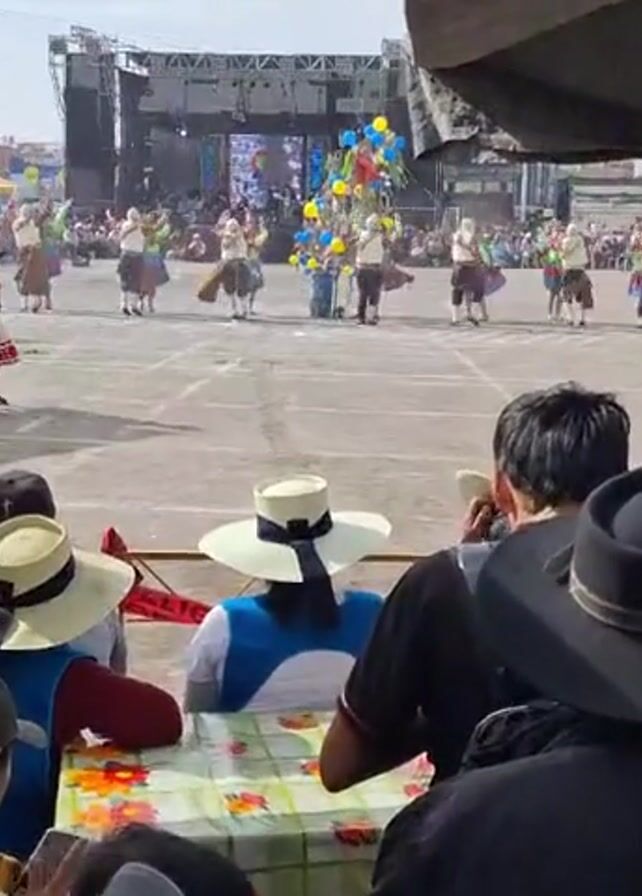 A celebration unfolds on a sunny day. A large, flat space serves as the stage for a folk dance, where performers in traditional Peruvian clothing move energetically. The dancers are clad in bright hues and patterns, adorned with elaborate hats, some bearing greenery or festive ornaments. Blue and yellow balloons add to the festive ambiance. A makeshift backdrop features a large screen, likely displaying live footage of the event, with a band providing musical accompaniment on stage. The audience, positioned in the foreground, watches the spectacle, sheltered under tents and umbrellas. They are dressed in casual attire, some sporting hats and caps. Tables covered with patterned tablecloths are set up in front of the audience. The entire scene exudes a sense of cultural pride and joyful celebration.