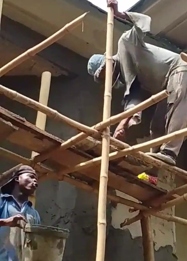 Two men are working on the outside of a building. One man is standing on a bamboo scaffold, holding onto a vertical bamboo support. He is wearing a long-sleeved light-colored shirt and dark pants. He appears to be doing something to the building wall. Another man is also on the scaffold, wearing a blue shirt, red shorts, and a baseball cap. He is holding a bucket. The scaffold is made of bamboo poles and wooden planks, set against a gray stucco wall. The sky is visible at the top of the frame.