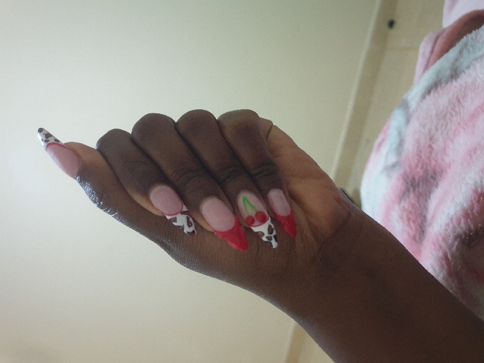 A close-up shot showcases a dark-skinned hand with elaborately designed, elongated nails. The nails feature a combination of styles: French tips with a light pink base, a cow-print pattern on some tips, and a red tip with a cherry design on one nail. The nails are sharp and pointed, with a glossy finish. The background is blurry and consists of white wall and pink and white soft fabric.