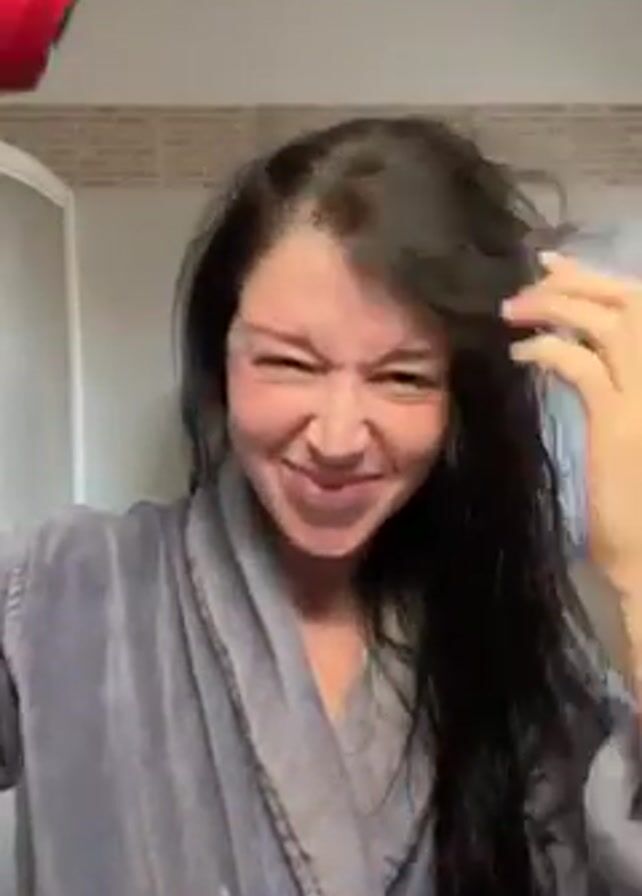 A woman in a gray robe is in a bathroom. She has long, dark, wet hair and makes a face at the camera before using a red hair dryer on it. The bathroom has a shower stall and brown tile in the background.