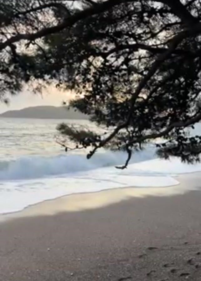 A tranquil coastal scene shows gentle waves lapping onto a dark sand beach under the shade of an evergreen tree