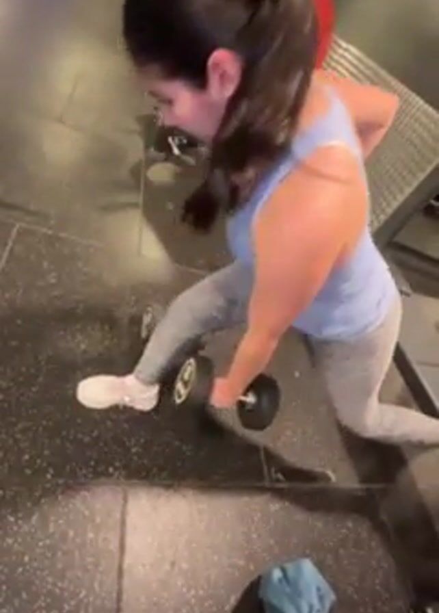woman at a gym, performing a dumbbell row exercise. She is in a lunge position, holding a dumbbell in her right hand. She is wearing a light blue tank top and gray leggings. Other people are visible in the background using gym equipment. The floor has a dark grey patterned surface. A towel is on the floor in the foreground.