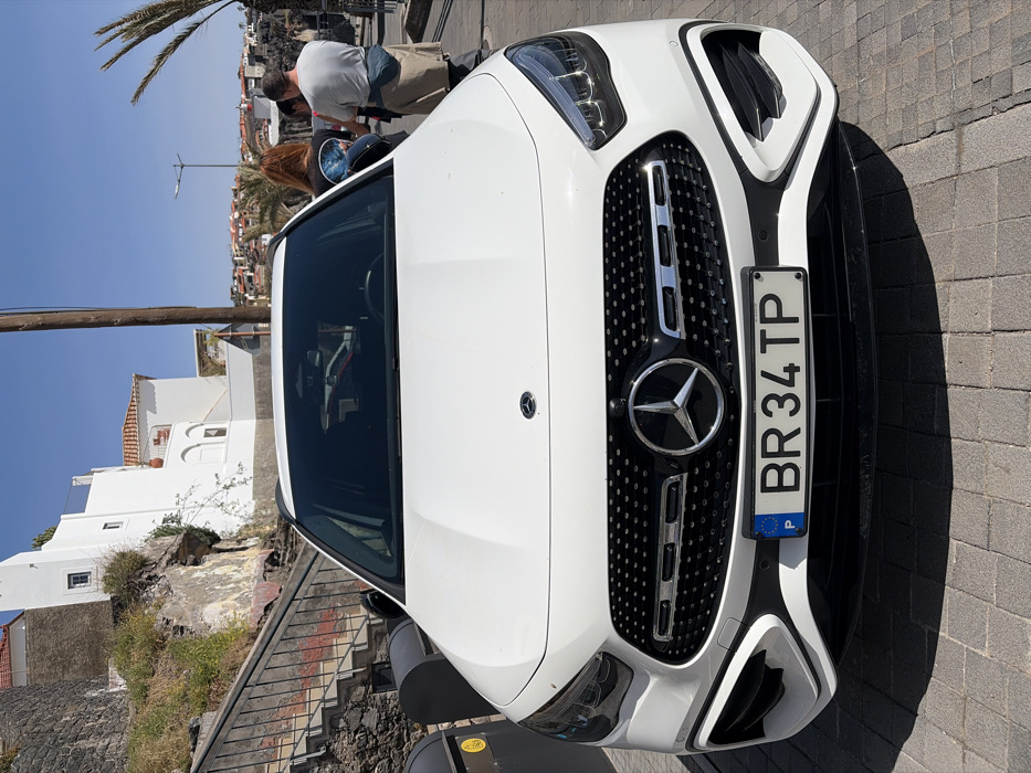 A white Mercedes-Benz vehicle, license plate P BR 34 TP, is centrally positioned and prominently featured, parked on a paved surface in Câmara de Lobos, Portugal